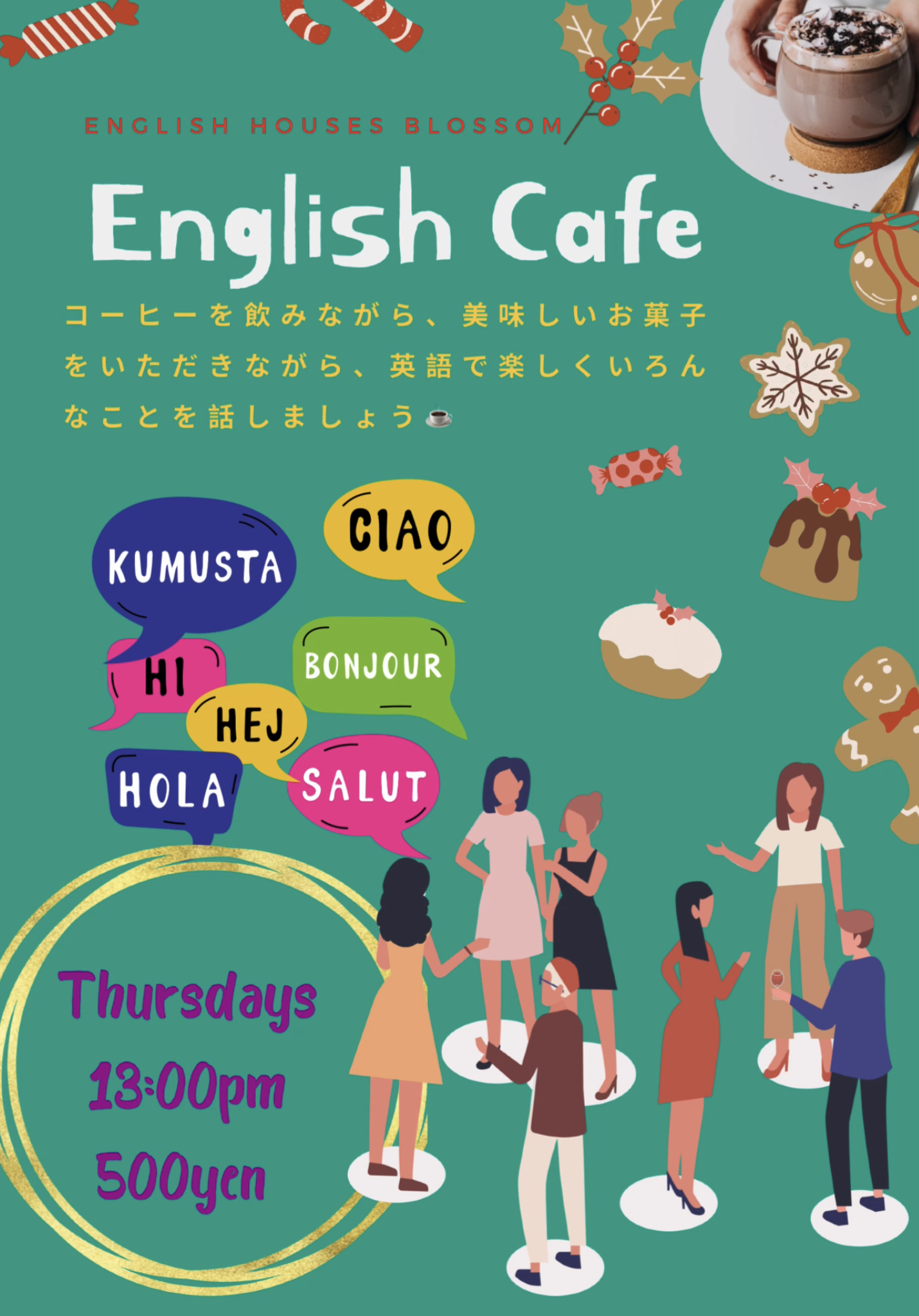 毎週木曜日13時から。ワンコイン?500円で、みんなで楽しく英語を話しましょう?
